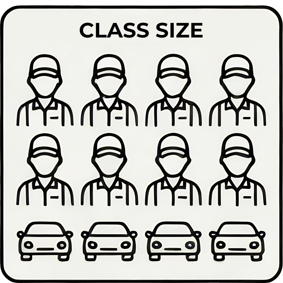 Ideal size is 8 - 12 technicians per session. 4 vehicles for meaningful practical time.